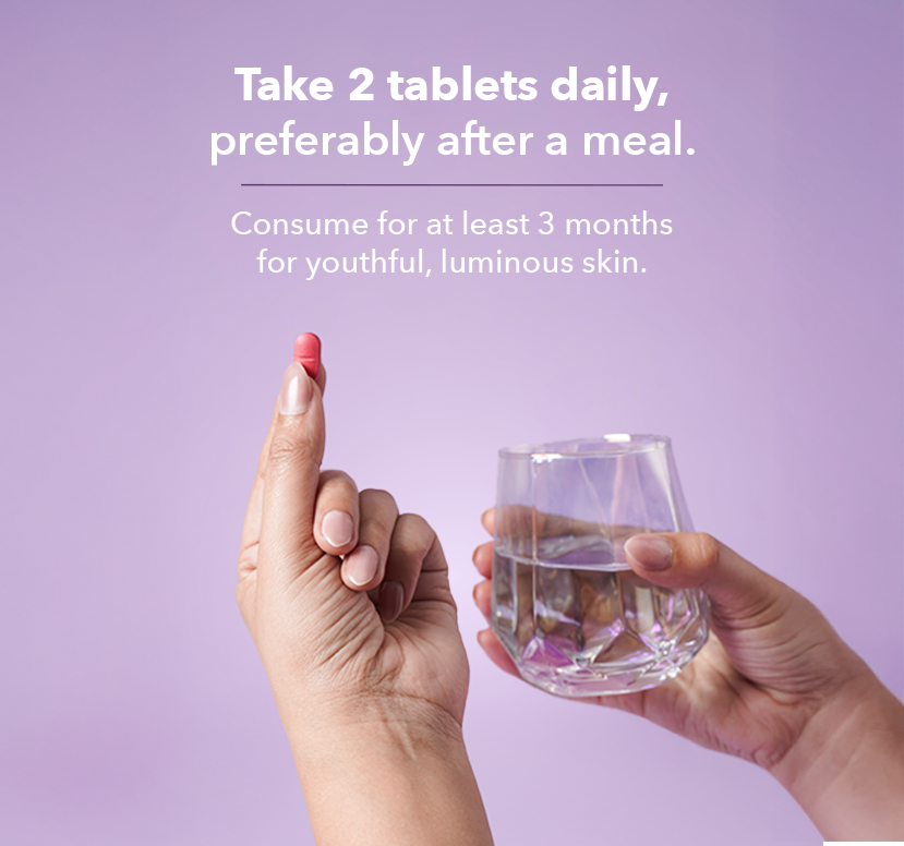 For a radiant boost, complement your skincare routine with two tablets dailyâtake them together before or after a meal.