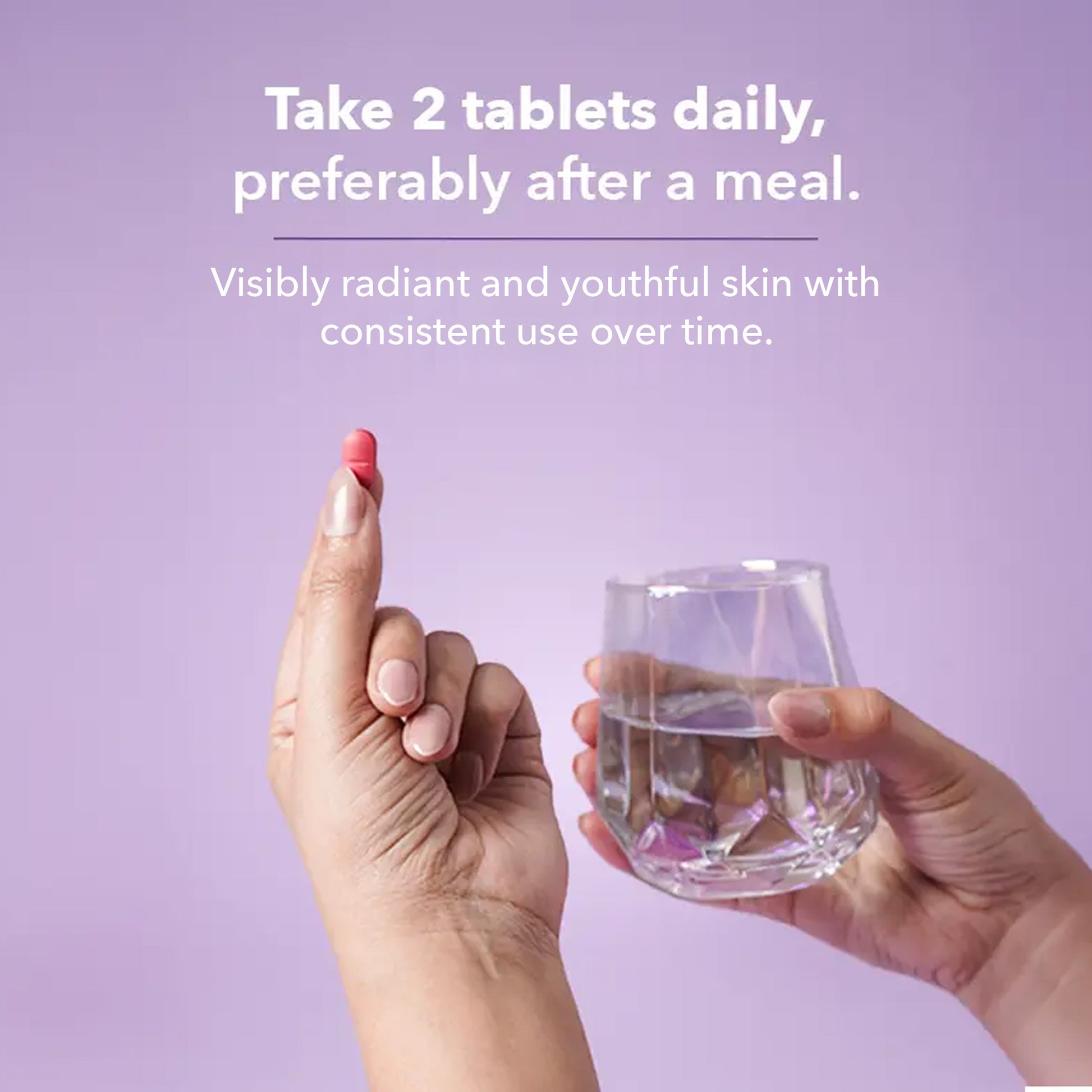 Take 2 tablets together daily, preferably after lunch or dinner, with a glass of water. For best results, use consistently for at least 3 months to see naturally radiant skin.